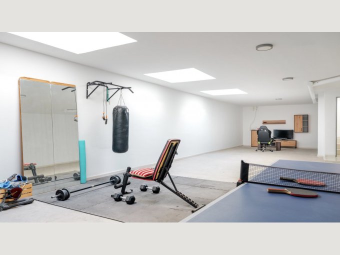 The lower level features a flexible lounge space, perfect for a gym, home cinema, or games room, with direct access to a multi-car underground garage. The outdoor areas are designed for both relaxation and entertaining, featuring mature palm trees, fruit trees, and beautifully landscaped gardens.